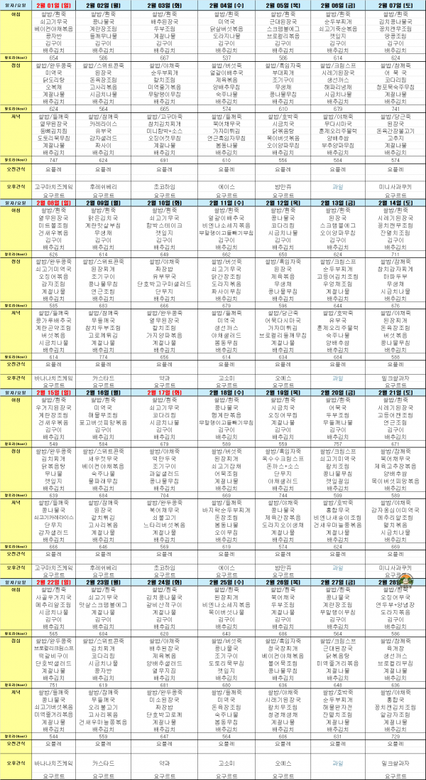 ♡2월 맛있는 식단표♡ 페이지 정보 작성자 닥터M요양원 댓글 0건 조회 18회 작성일 26-02-02 22:28 목록 본문 ♡2월 맛있는 식단표♡ 다음글❤️2026년 새해를 여는 1월의 건강한 식단표❤️ 25.12.31 댓글 0 댓글목록 등록된 댓글이 없습니다.
